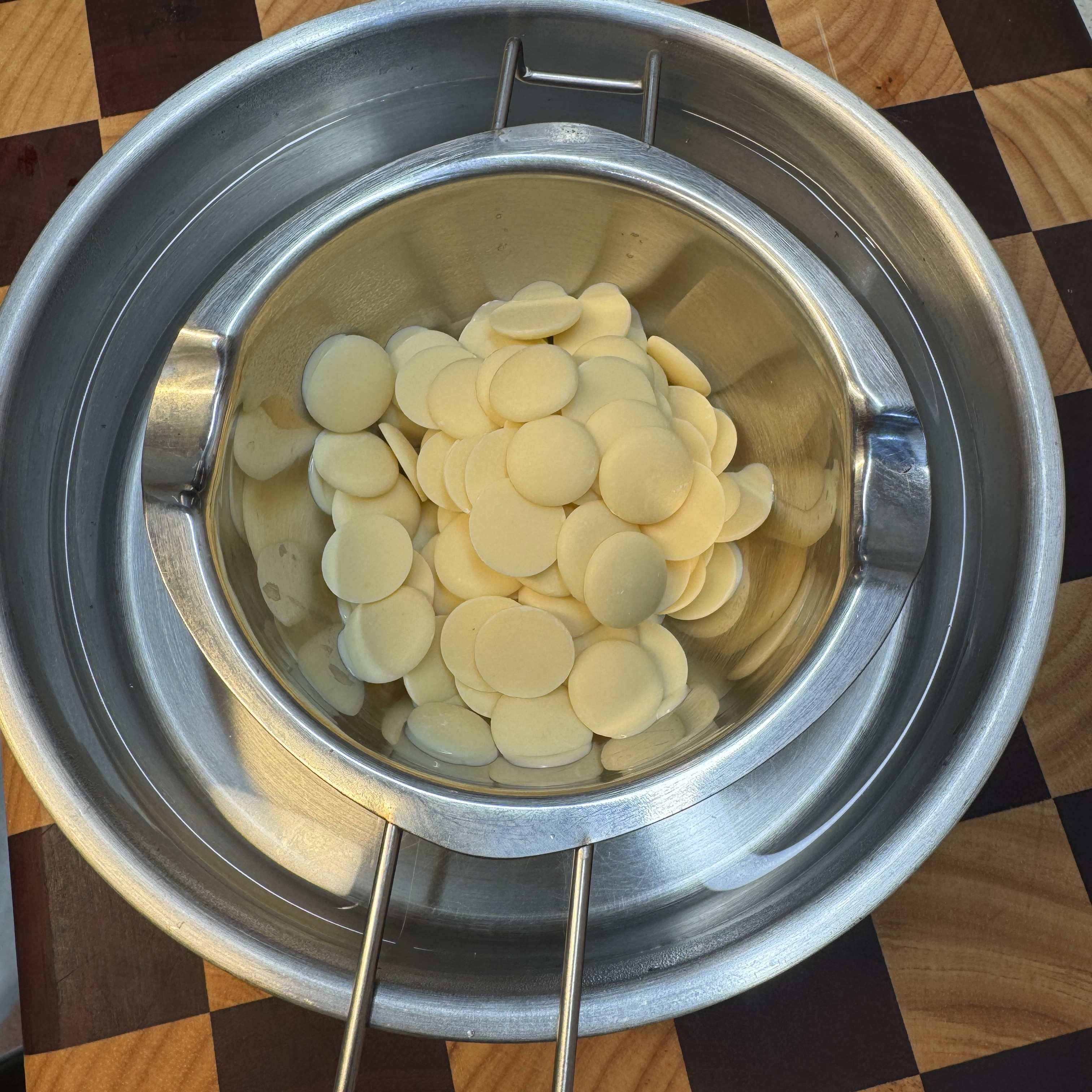 4,100克白巧克力币,隔着65度的温水融化。