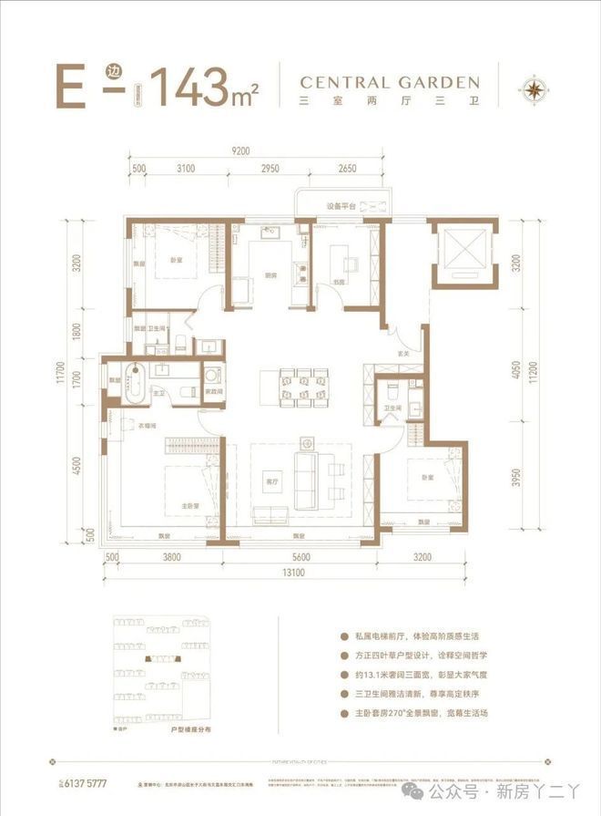 143平米四室两厅三卫,中间户私属电梯厅,南向双套房,三卫生间标配,主卧套房270°全景飘窗