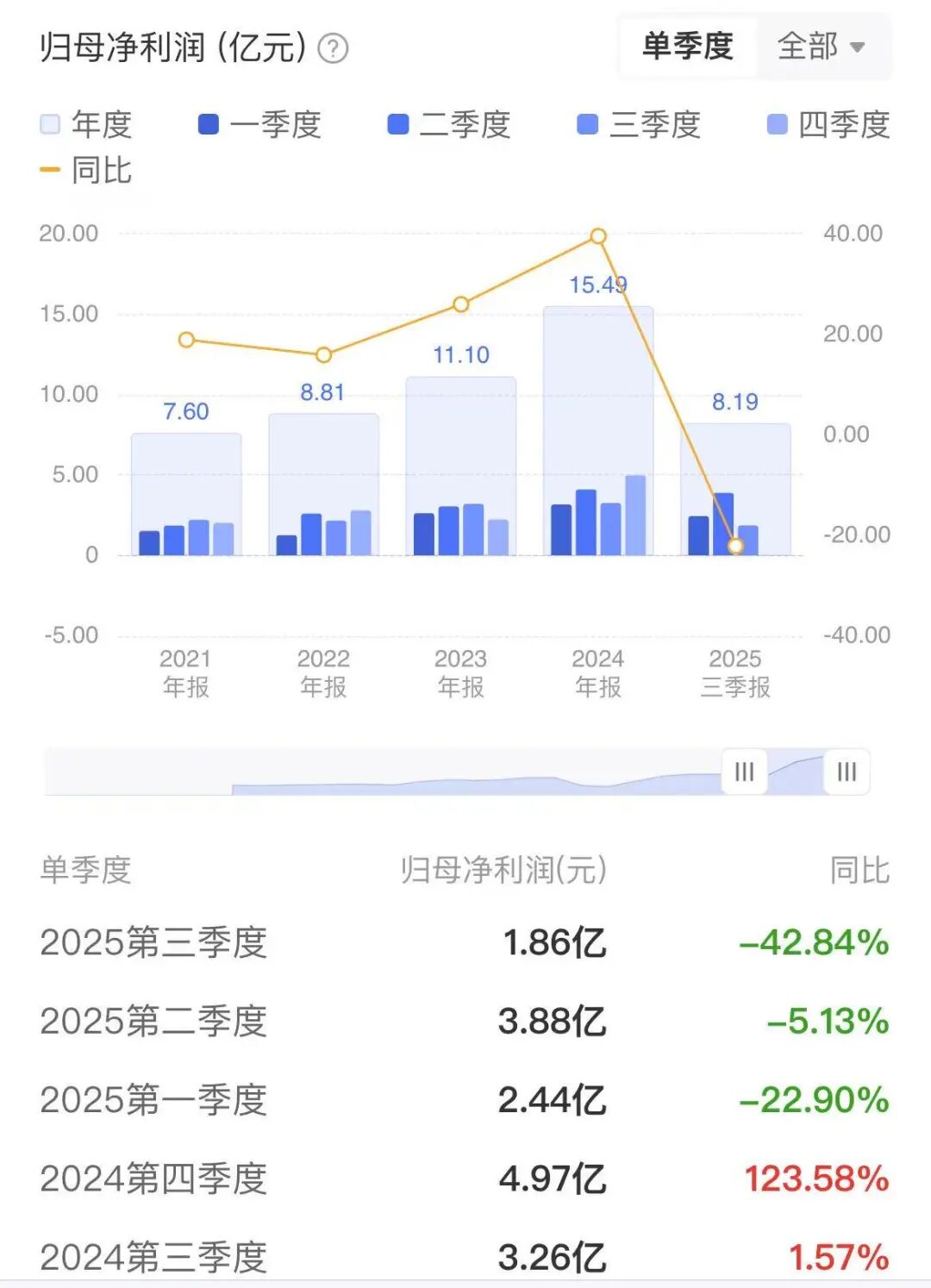 但进入2025年,公司前三季度营收44.65亿元,同比增长9.62%,净利润则是出现了22.16%的下滑,为8.19亿元。 其中,公司第三季度归母净利润降幅扩大至42.84%。