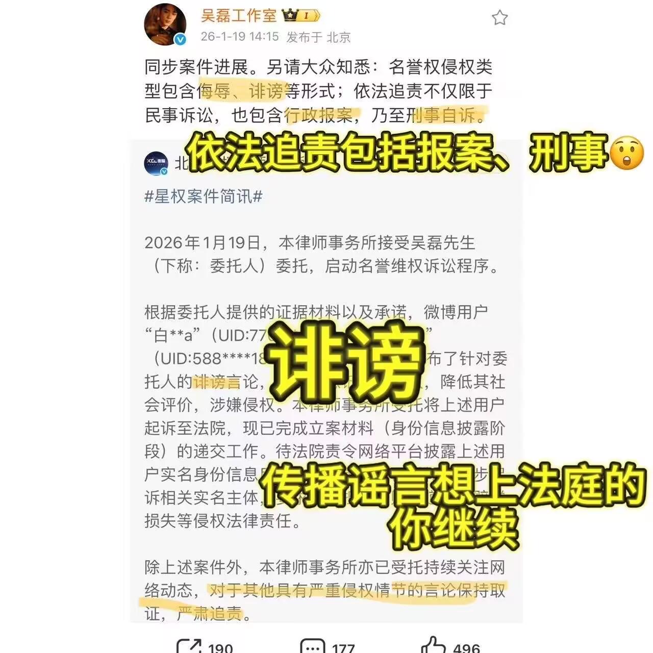 工作室再次态度强硬地用行动告诉大家,这件事他们会追究到底。同时还给大家科普了一下,名誉权侵权包含侮辱和诽谤等形式,依法追究不仅包括民事诉讼,还包含刑事自诉。