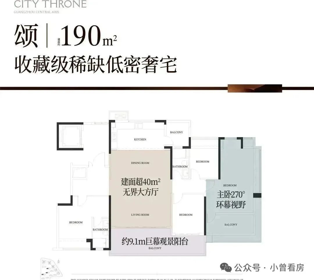 位于西边户的户型,三面景观,西面白云山景观,南向广州中轴+园林景观,北向白云山+园景;再加上约21米270°云山观景面,视觉享受拉满了。