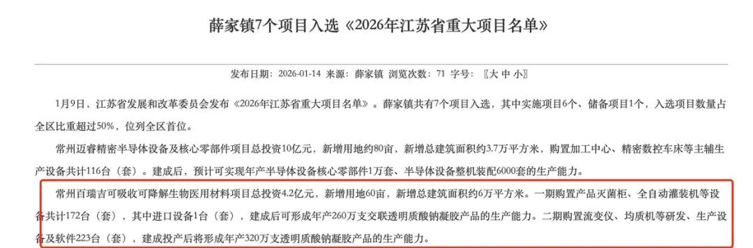 但据常州国家高新区管委会网站发布的《薛家镇7个项目入选2026年江苏省重大项目名单》一文显示,百瑞吉可吸收可降解生物医用材料项目总投资4.2亿元,高于招股书披露。