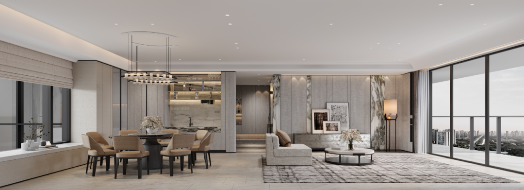 1.8m宽双开铸铝装甲门提升归家仪式感。玄关右侧设鞋柜,左侧为步入鞋帽间,储物空间充足。半透玄关背景墙与空中茶室相连,营造空中庭院意境。约70㎡餐客厅将客-餐-厨-阳台空间整合在同一直线,形成家庭核心区,拥有开阔的东南向景观面宽。