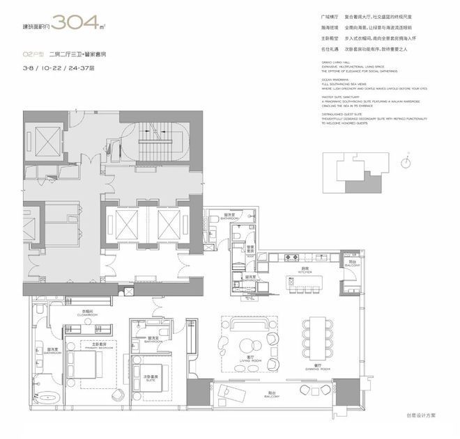户型亮点:全套房设计+家政套间,适配多代同堂或高端社交需求;超大观景面,景观资源优越;全球大师定制空间,居住与社交属性兼具,是塔尖家庭的核心居住选择。