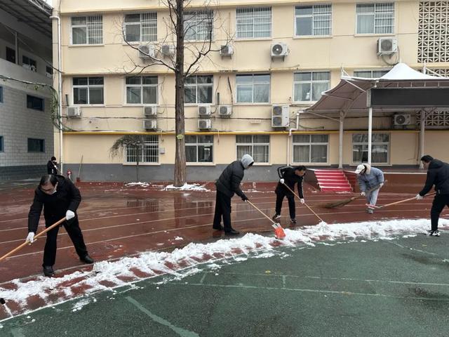寒风中,学校教职工是除雪行动的主力军。李超校长手持推雪板冲锋在前,带领老师们清理校园主干道厚雪。同时,社区工作人员发挥了关键协同作用。大家手持铁锹带头铲除社区主干道与校园衔接处的压实积冰。扫雪的“沙沙”声、铲冰的“嚓嚓”声与大家的吆喝声交织,成为冬日里最温暖的旋律。
