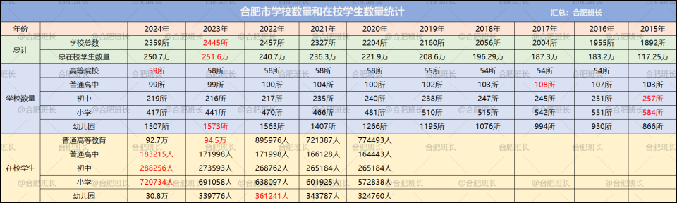 再来看看合肥市的数据,因为班长没有找到2015年到2019年在校学生数量的数据,所以这部分缺失,见谅。