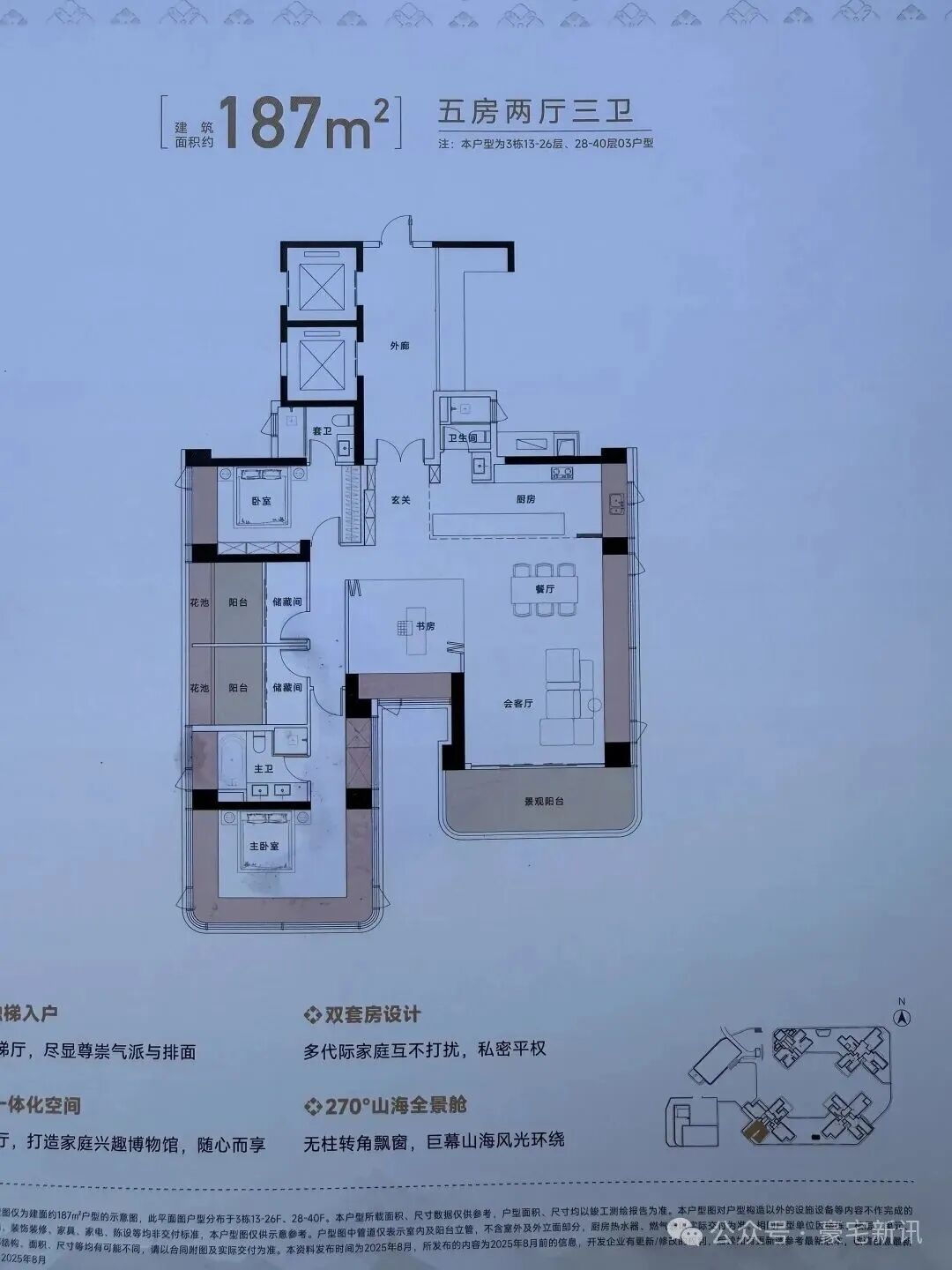 将地标高度/创新设计/极致景观/自然融合四大要素集于一体,约150米地标建筑以45°错位转体设计,实现四户分踞四角的独立瞰景布局,每户均可享有极致山海景观。约55米超宽楼间距、0.6的黄金窗墙比远超常规住宅0.3-0.5的标准,呈现山景、海景、花园三重景观界面。