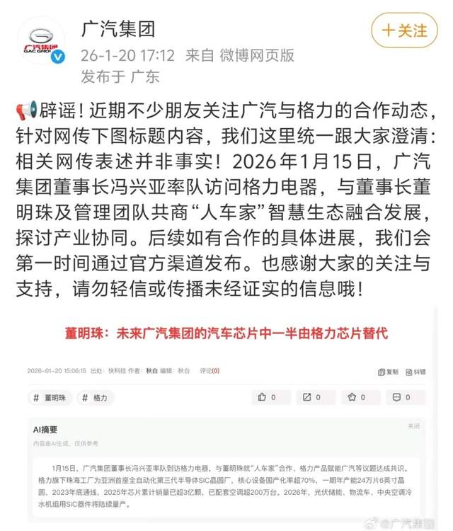 但真正引发行业热议的,是几天前格力电器董事长董明珠接待广汽集团董事长冯兴亚时那句半开玩笑的表态,未来广汽的汽车芯片中将有一半由格力产品替代。如今这句话已在网上掀起轩然大波,引得广汽集团正式出面辟谣:“相关网传表述并非事实。”但格力是否有这个能力供应广汽一半汽车芯片依然成为大家广泛谈论的话题。