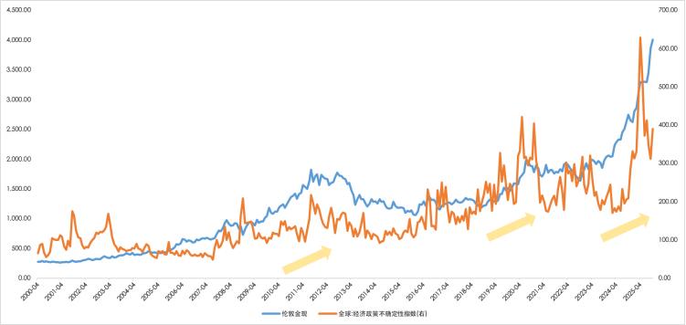 图:全球经济不确定性上升时,黄金资产价格中枢呈现上移态势