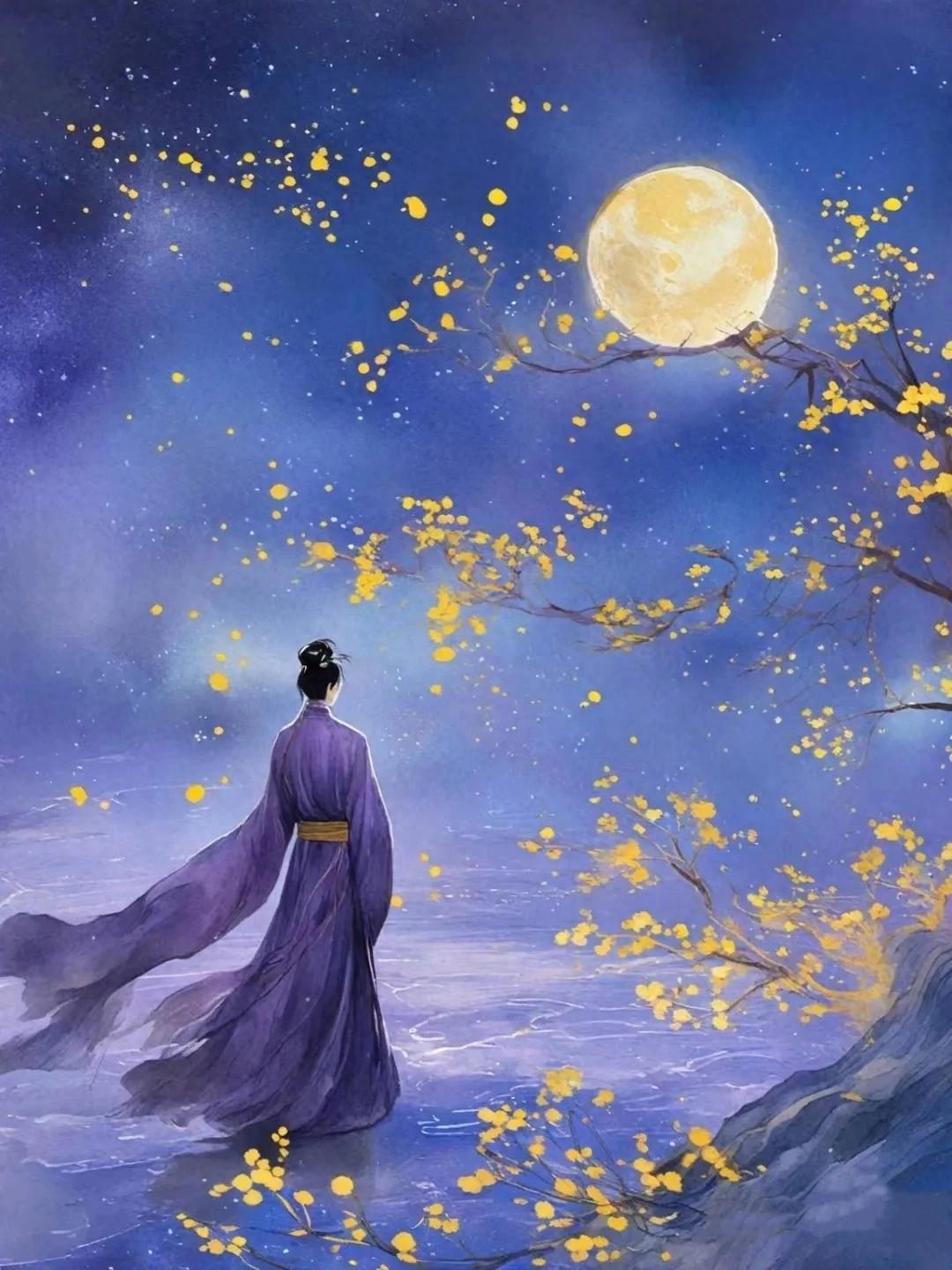 星空低垂,原野辽阔无边,明亮的月光下江水汹涌澎湃,奔腾不息。