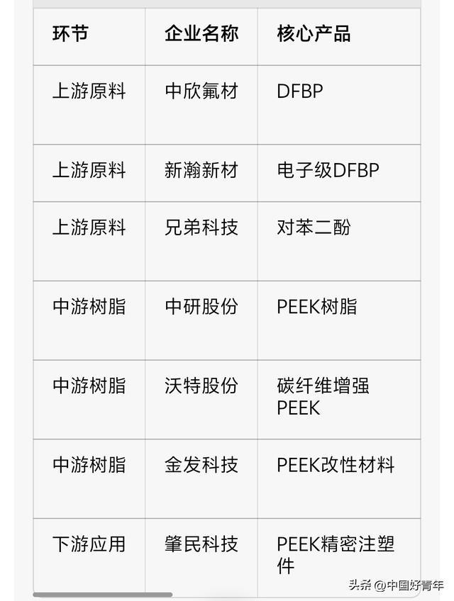 从表格中可以清晰地看到:上游原料领域集中度高,中欣氟材和新瀚新材占据主导地位;中游树脂领域,中研股份技术领先,沃特股份和金发科技各具特色;下游应用领域,肇民科技独占鳌头。这种产业链分工,构成了国产PEEK产业的完整生态。