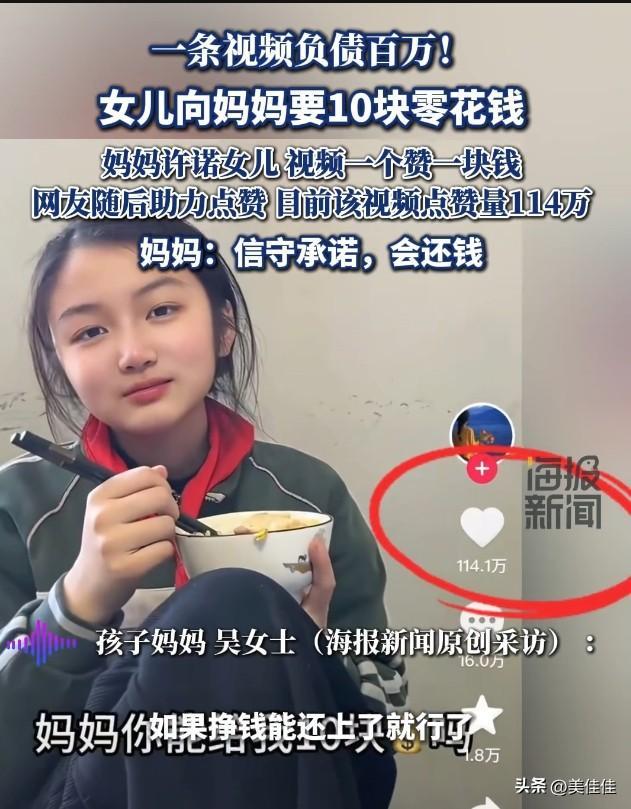 一位妈妈随口许诺女儿“视频一个赞给一块钱”,本想着给个十块八块的零花钱打发了事,没想网友们“集体搞事情”,硬生生把点赞数干到了114万!看着还在飙升的数字,女儿乐开了花,妈妈却成了“百万负婆”,甚至哭笑不得地喊出“实在不行就把房子抵给女儿”。