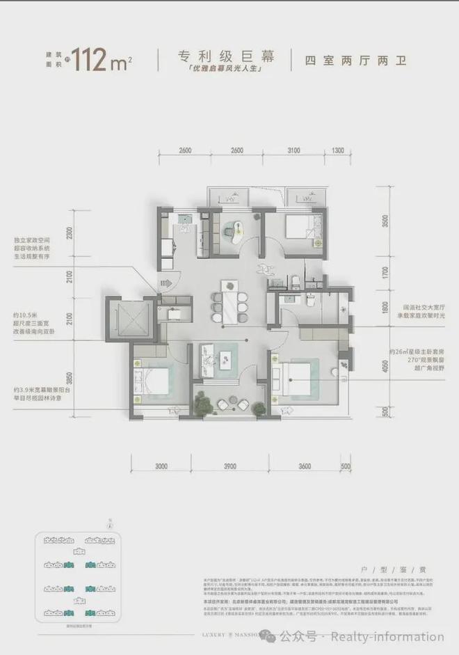 建面约112㎡四居拥有“专利级”巨幕,凌雲颂售楼处电话:400-809-6780堪称全景四居标杆,南向巨幕开间,全明四房零浪费。