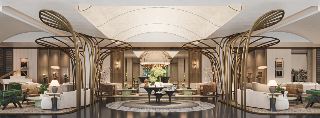阅读冥想区:大面积玻璃幕墙,引入庭院绿意,让阅读成为与自然对话的过程。空间设计延续东方海派风格,搭配仿铜色金属线条与木质家具,静谧又不失格调。