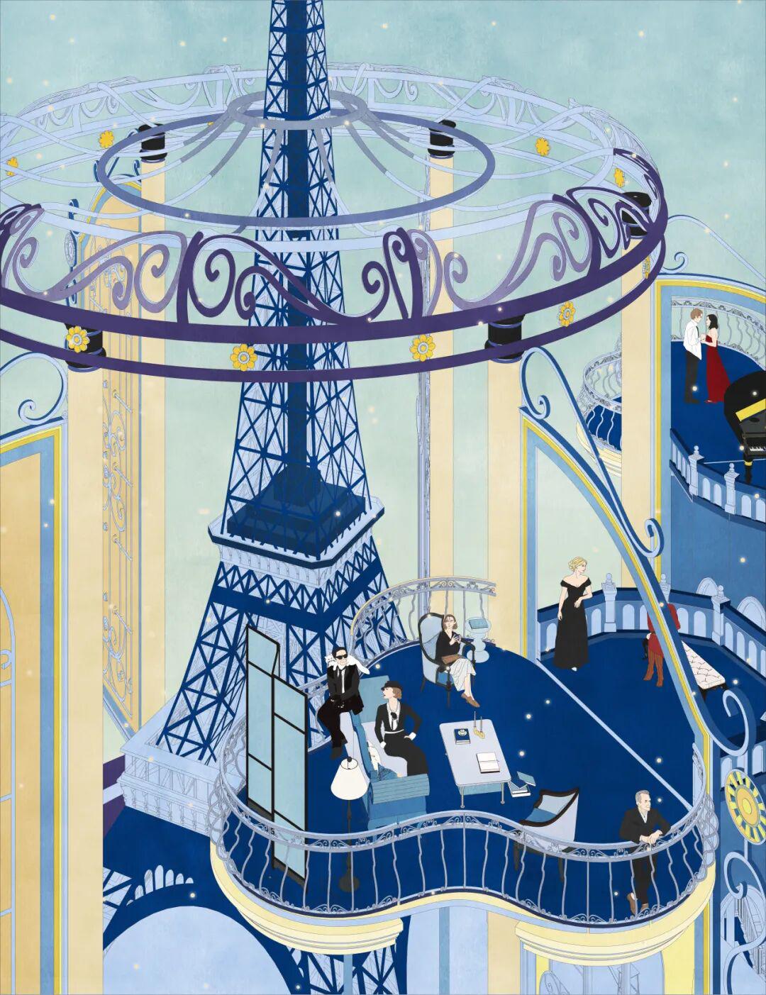整幅画像是一个被放大、被梦化的音乐盒。埃菲尔铁塔成为音乐盒的“中轴齿轮”,而原本盛放雪茄的架子如今成为了微型舞台。当手轻轻拨动底座,整座“巴黎”便开始旋转。它就像一件巨型的法式机械艺术品(Automaton),融合了巴黎的浪漫建筑、音乐盒的精致机械感、以及戏剧般的生活切片。