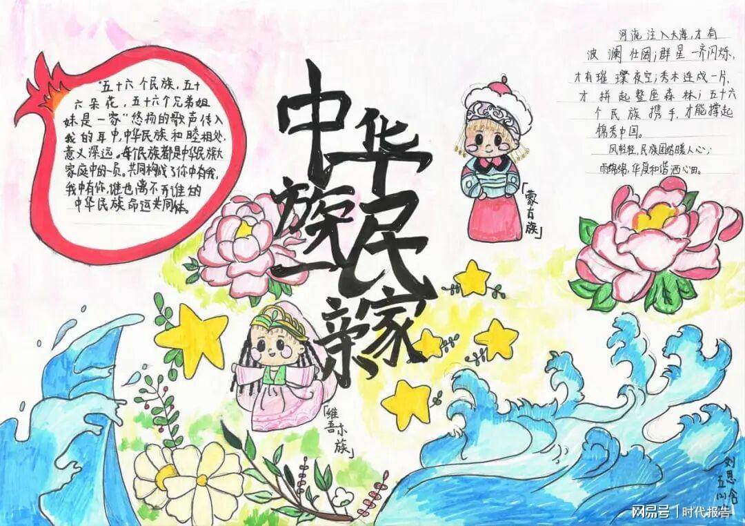五(11)班 郭沐濡:我画的这幅手抄报以“中华民族一家亲”为主题,想画出各民族像一家人一样的感觉。左边我画了穿藏族服饰的小姐姐,搭配向日葵,看着特别有朝气;中间用中国地图当背景写了“中国”,还在旁边的文字区写下我理解的民族团结的意义;右边画了石榴和牡丹,石榴籽紧紧挨在一起,就像我们各民族同胞。我用了鲜艳的颜色,把民族元素和象征图案结合起来,希望能让大家感受到各民族同心协力、共爱祖国的美好呀。