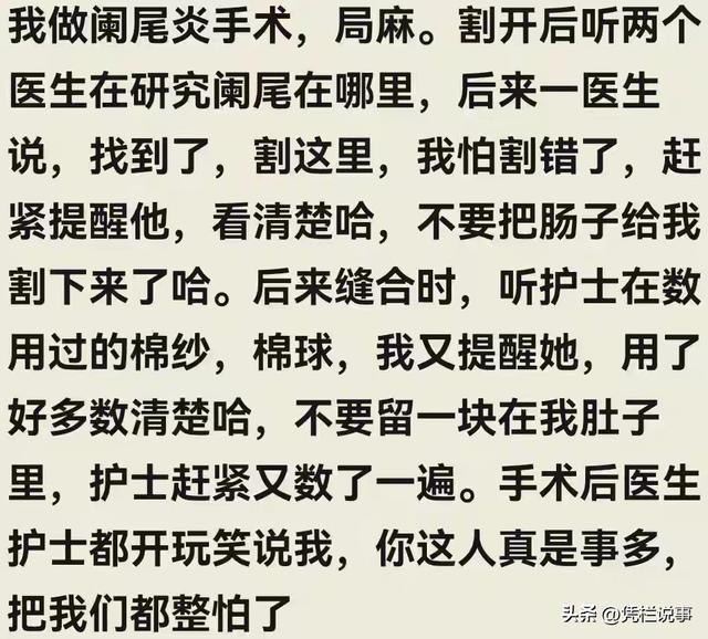 你们说这些都是现代医疗的小儿科。我阑尾炎手术是镇上医院做的,我天生对麻药有抗性,那时候也没有进口利多卡因,手脚都被绑住,生割的,每一刀每一剪子每针缝线都是硬生生清醒的,我撕心裂肺的吼叫