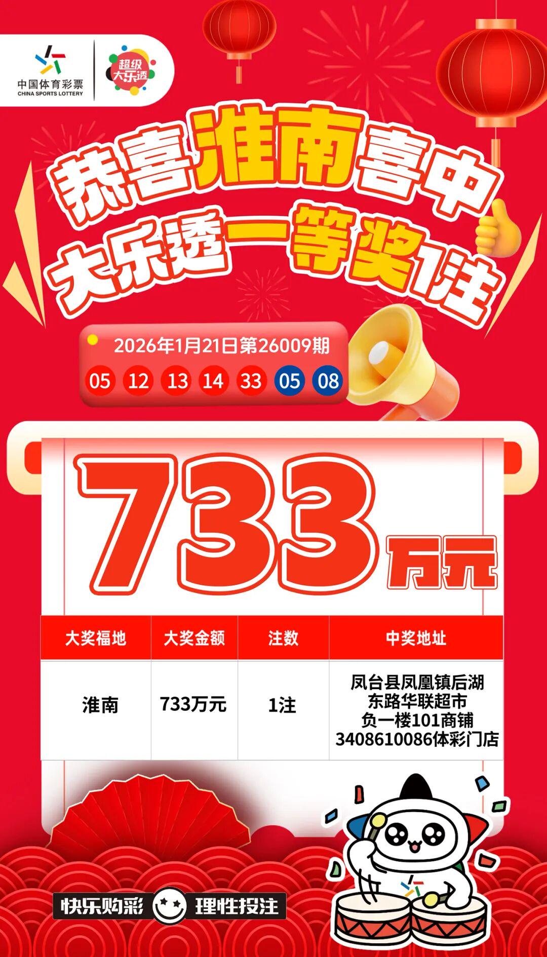 2026年1月21日,体彩超级大乐透一等奖喜报传来,花落淮南!一位幸运购彩者在淮南凤台县凤凰镇的一家体彩小微门店,成功中得一等奖,斩获总奖金733万元。这不仅是淮南体彩在2026年迎来的首个超级大乐透头奖,也一举打破了自2022年中出995万大奖后,长达三年的“头奖沉寂”。