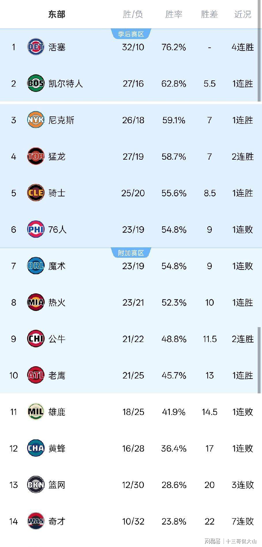 东部排行榜与西部如出一辙,活塞队四连胜后遥遥领先,领先第二名的凯尔特人5.5个胜差。从第二名的凯尔特人到第七名的魔术,彼此之间只差了3.5个胜差。