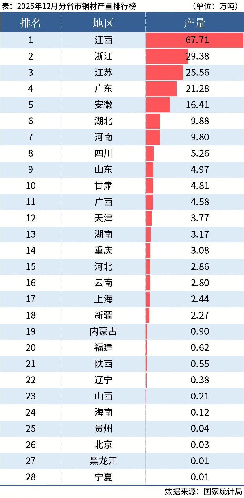 国家统计局最新数据显示,2025年1-12月中国铜材累计产量2481.4万吨,同比增长4.7%。其中,产量排名前三的省份分别是江西、浙江和江苏,江西铜材产量为647.46万吨。具体情况如下: