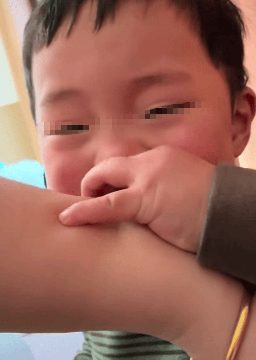 然后就看见,妈妈的手臂当时就肿了。这期间,孩子还伴随着用手打等行为。妈妈就一直忍受着,看着孩子一口又一口的咬下去。