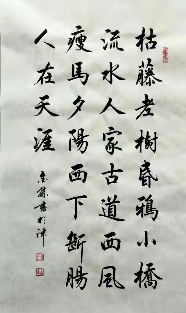更难得的是,笔下笔笔有出处,字字有古法,这是书法学习者对传统的敬畏,更是功底的最佳证明。真正的书法,从不是凭空创造,而是站在古人的肩膀上,取法经典,融于己身。这副书法的每一笔,都能在经典碑帖中找到源头,或取法二王的灵动,或借鉴欧颜柳赵的端稳,笔笔有宗,字字有源,既不是对古法的机械复刻,也不是脱离传统的标新立异,而是将古法精髓融于笔墨,化作自己的书写语言。也正因如此,笔下文字才有着深厚的传统底蕴,越看越有味道,越品越见功夫。