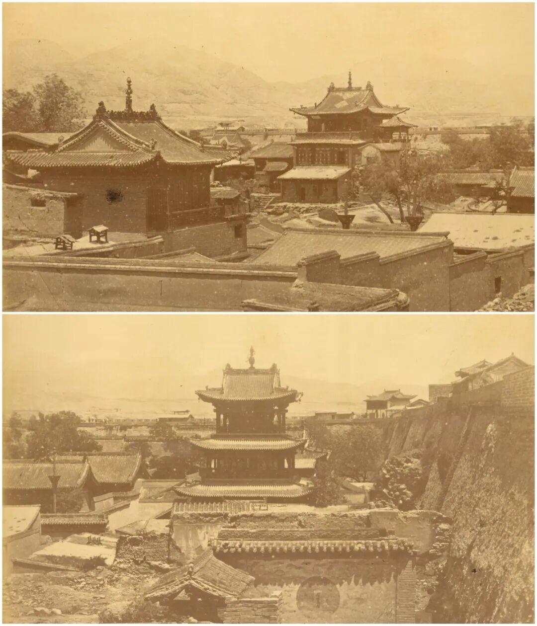 1875年,新疆巴里坤(镇西府), 满洲城和中国城在城墙内并存, 可见庄严的寺庙屋顶以及店铺和民居的泥土石灰屋顶。