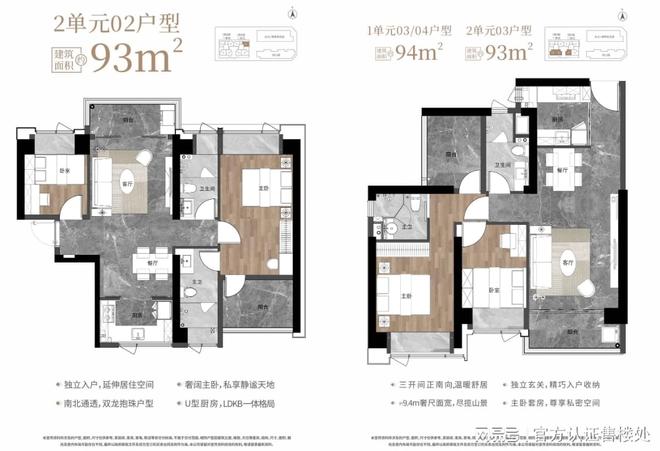 格局B(1栋1单元03/04/2单元03户型)三开间朝南:面宽达9.4米,LDKB 一体化设计,二字型厨房连接生活阳台,主卧套房带衣帽间,采光通风条件优异。