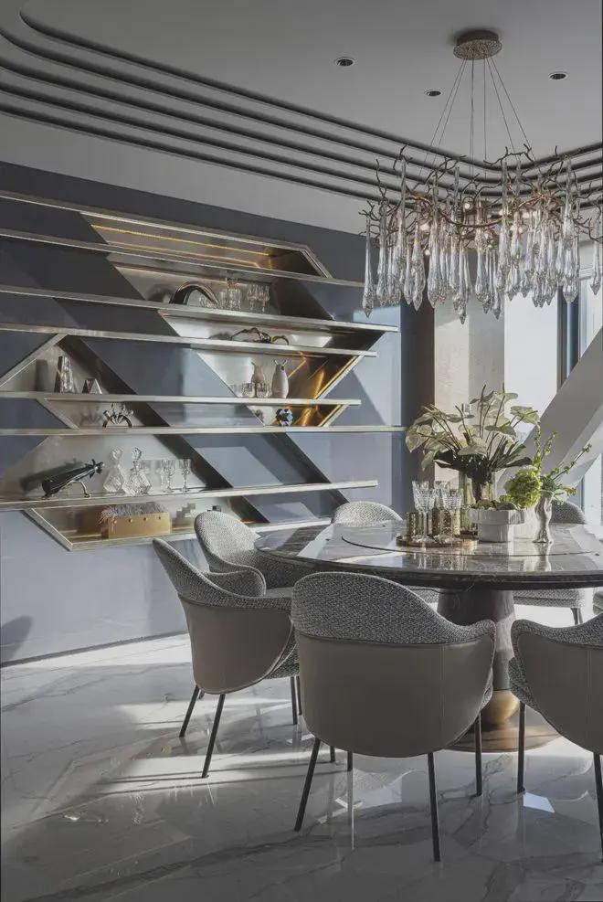 灰调布艺围合着着长长的彩色金属条的浅咖色圆形桌椅,与镶台呼呼的圆形桌椅。挂件浑然天成。的家具结构,为空间着染摩登范,辉映财富世界的内在缩影。