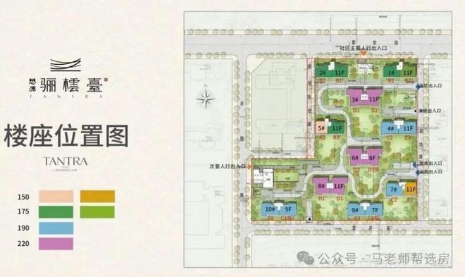 从楼座位置图可以看出,1、2号楼为统一的175㎡户型,适合对舒适度有更高要求的改善家庭;3、6、8号楼为核心楼座,统一为220㎡户型,适配高端纯粹客群;4、7、9、10号楼以190㎡为主力,其中7号楼东侧仅少量150㎡户型。