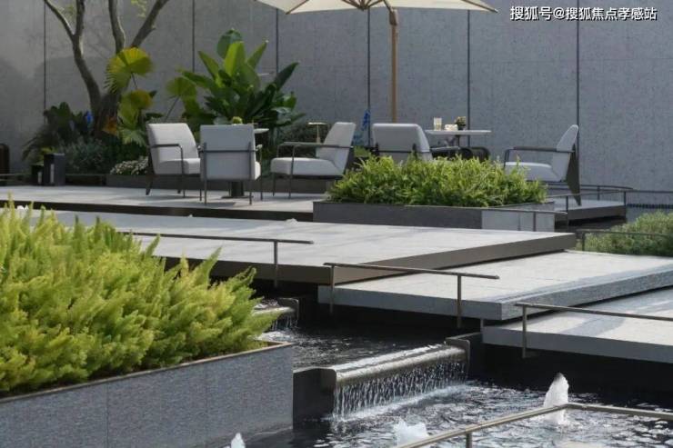 入口迎宾水景区带来了前所未有的视觉与心灵享受。绿化丛中巧妙设置了林下卡座,提供一片静谧的休憩天地,享受一份难得的清凉与宁静。通过精心规划的水景,水流潺潺而下,层叠跌宕,以清澈的水声,营造出一种远离尘嚣的宁静氛围,这一设计展现了水的柔美与力量,仿佛穿越至江南水乡。层叠绿化与水景结合既丰富了景观层次,又巧妙地将自然元素融入每一寸空间,引导访客进入售楼处。