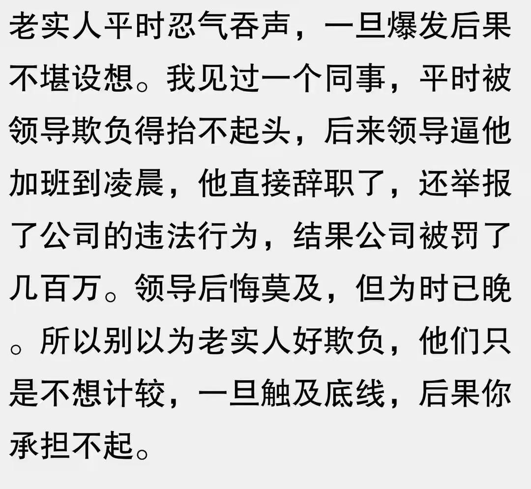 说真的,任何一个老实人都不能被太欺负了,得饶人处且饶人,帮助别人,有时候也是帮助自己