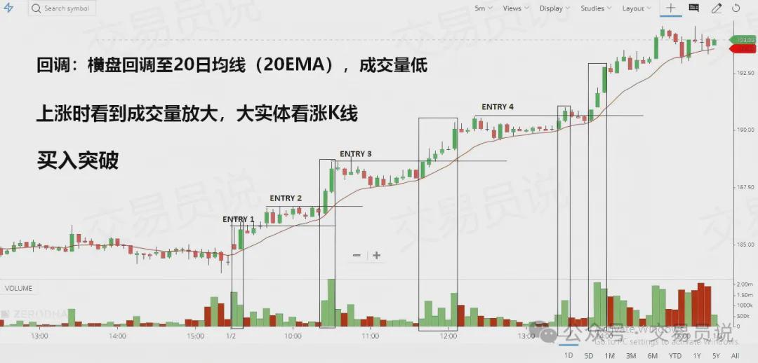 你可以预期这种趋势会出现适度的回调,通常回调至20日指数均线(20EMA)附近,这为顺势入场提供了机会。回调时通常伴随低成交量、窄幅区间或者下影线较长的K线。