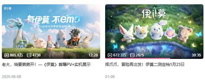 早在首曝初期,《伊莫》的影响力便迅速铺开,其2025年6月发布的首曝PV仅在B站平台就收获了超880万播放。半个月前放出的“二测定档”,目前也在B站上取得了670万播放,评论区期待、求码、好评、建议,搞笑玩梗应有尽有。二测开启后,有些直播间也涌进了不少玩家围观,产品颇受瞩目。