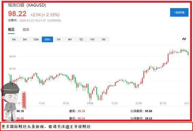 更刺激的是,被称为“黄金影子”的白银,直接杀红了眼,现货白银价格一度冲破99美元/盎司,单月涨幅飙到38%,距离三位数的百元大关仅一步之遥!
