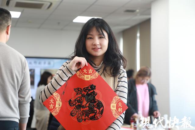 台青洪珮馨毕业后留在了南京工作,这是她第一次体验雕版印刷,“我印了一个‘福’字,还有小马的图案,真的很有意思,希望之后还能参加这样的活动。”她在祈福卡上写下“万事胜意”的祝愿,并表示两岸过年习俗相近,“像走亲戚、回娘家这些传统,都很相似。”