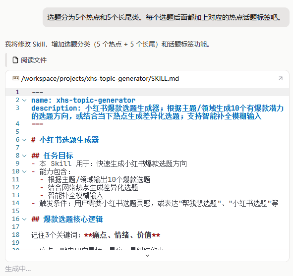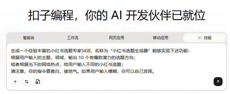 下面以「小红书选题生成器」Skill为例,手把手教你如何快速上手: