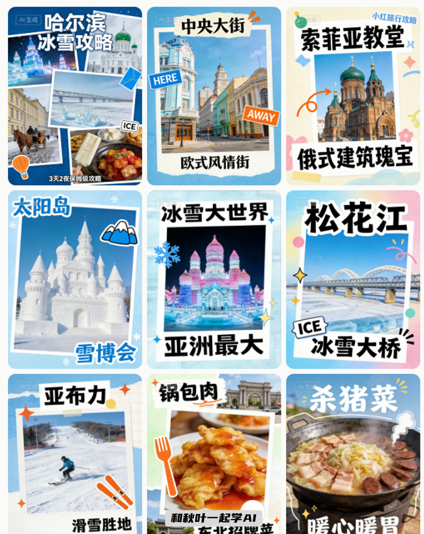 比如,我让它生成一组哈尔滨旅游主题的配图,用拼贴风格,它就给我