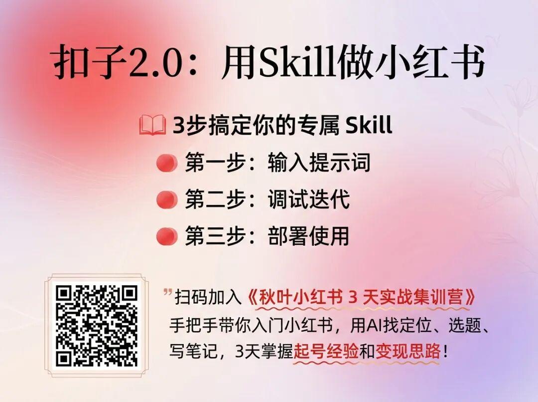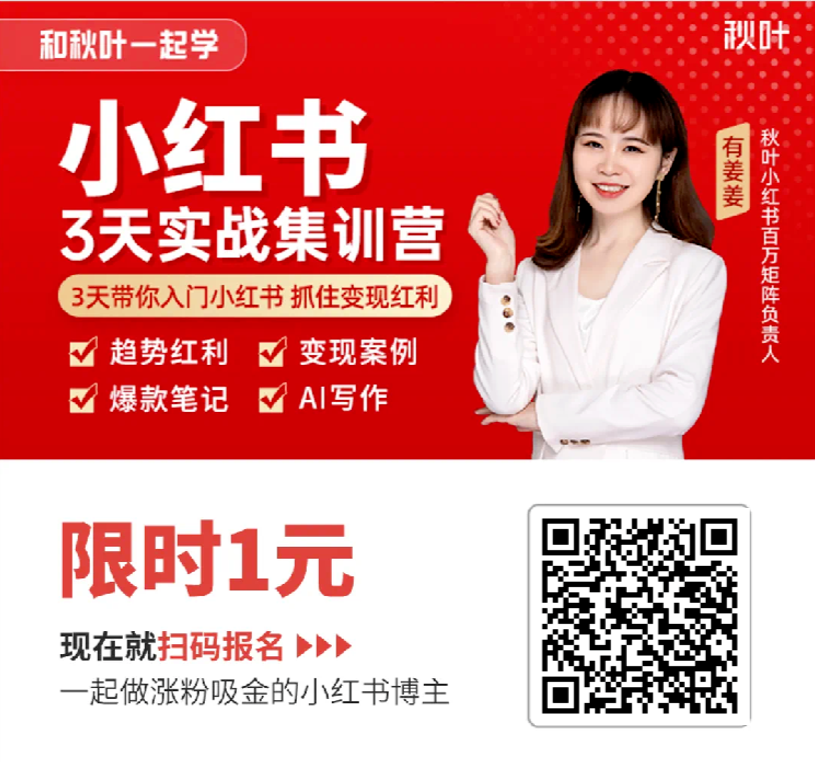现在做自媒体,不会用 AI 提效真的太吃亏了。如果你想更加系统学习 AI 做小红书的技巧,那我们强烈推荐你加入《秋叶小红书 3 天实战集训营》!