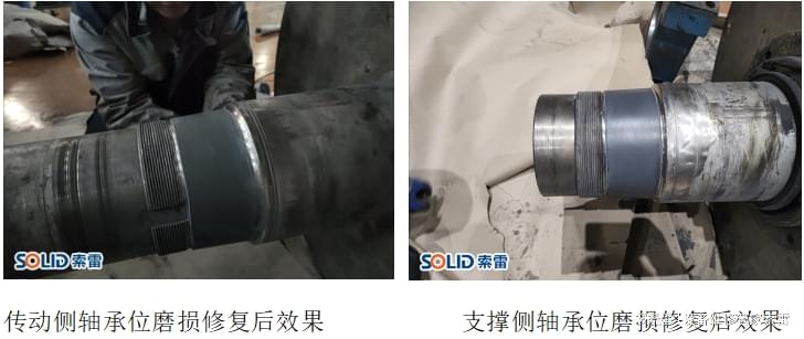 针对现场仅有一盘新轴承、非传动侧使用旧轴承(内圈有磨损)的情况,索雷技术人员在旧轴承内圈二次涂覆SD7101H材料,保证接触面积,最终将两侧轴承游隙从0.25-0.27mm精准锁紧至0.11-0.12mm的工作游隙,仅用两天时间完成全部修复与回装,完全满足企业开机计划。