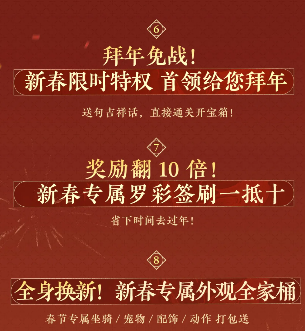 除此之外,春节期间,《逆水寒》收益还给玩家们准备了许多意外之喜,比如罗彩签刷一抵十,刷一次副本等于刷十次,让大家分分钟拿齐自己朝思暮想的副本时装、白发;再比如首领百年直接通关,既节省了时间又充满好彩头。此外还有888万份红包全民抢,四舍五入等于官方给玩家发压岁钱了。