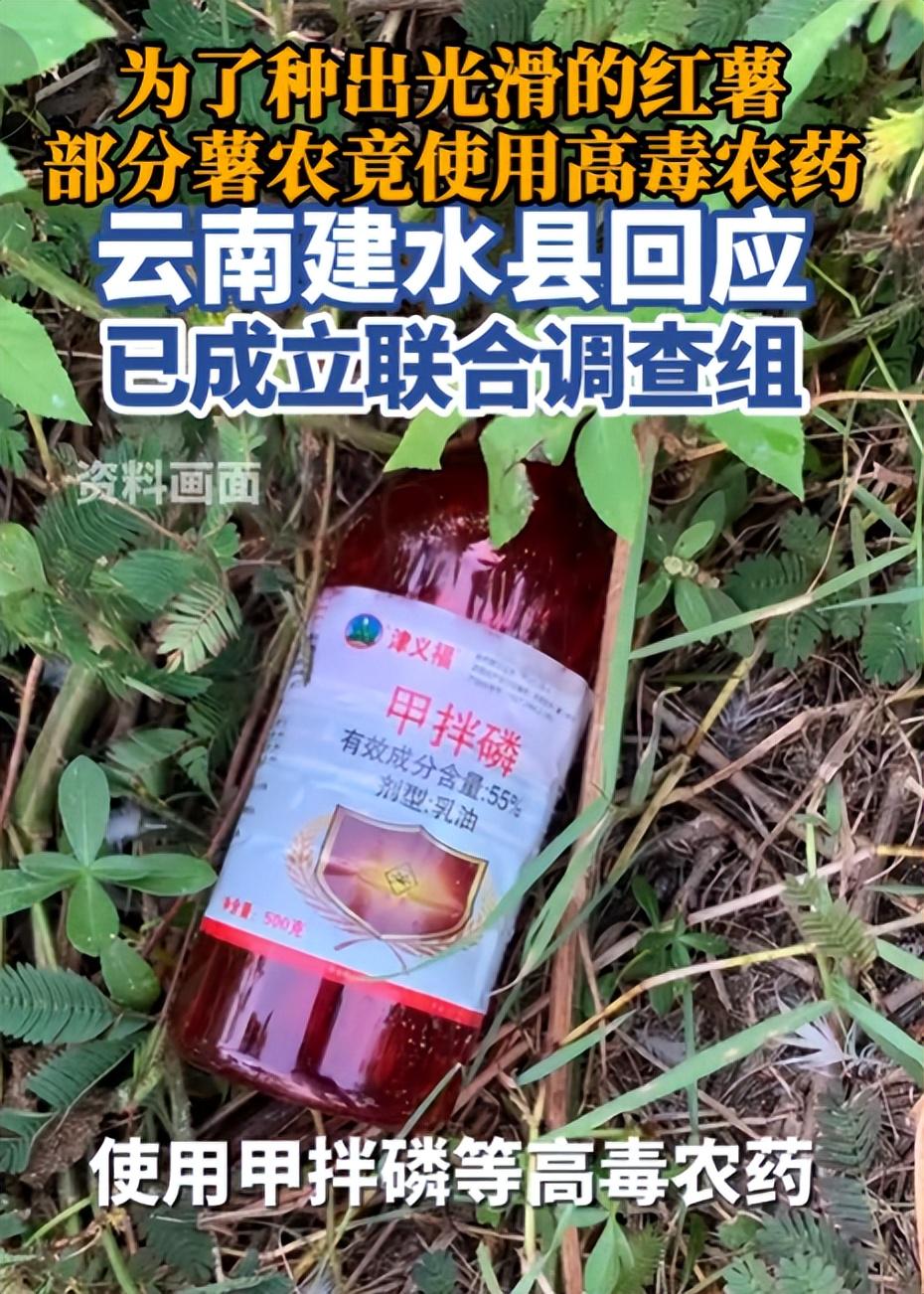 1月23日,面对央视对云南“毒红薯”的曝光,红河州建水县委相关部门也对外确认,已就“部分种植户使用甲拌磷等高毒农药种植红薯”一事成立联合调查组。