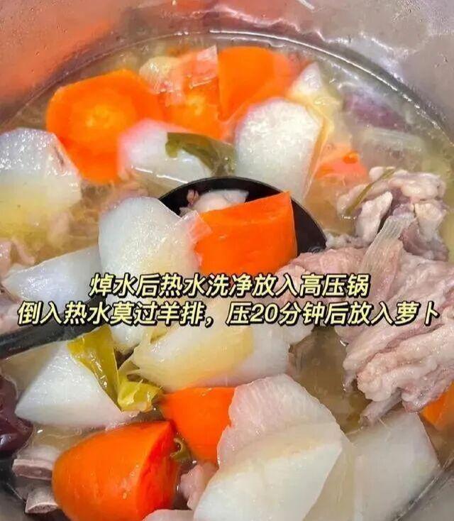 白萝卜切滚刀块 , 等羊排炖到七八成熟再放进去 , 萝卜吸了肉汤的油脂 , 又解腻又入味。