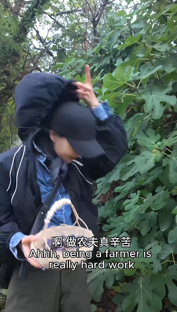 中途天突然下起了小雨,她也不避雨,反手就把外套的帽子套在头上,继续专注地摘果子。还笑着感慨了一句:“做农夫真辛苦。”