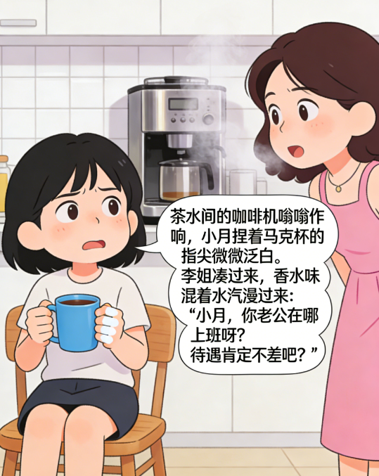 茶水间的咖啡机嗡嗡作响,小月捏着马克杯的指尖微微泛白。李姐凑过来,香水味混着水汽漫过来:“小月,你老公在哪上班呀?待遇肯定不差吧?”