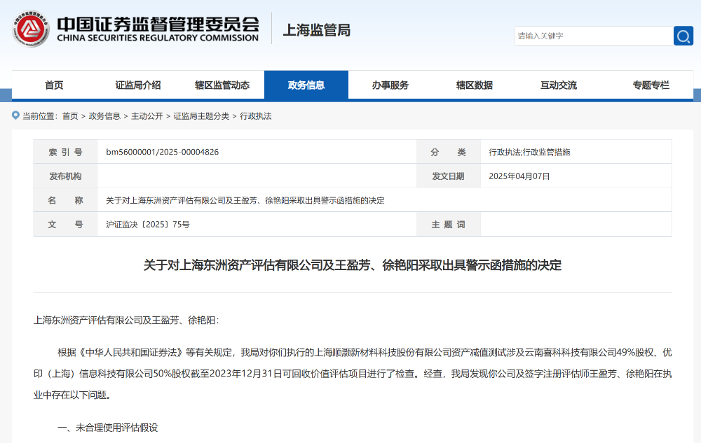 《电鳗财经》还关注到,2025年4月7日,上海证监局还曾发布关于对东洲评估及王盈芳、徐艳阳采取出具警示函措施的决定。根据有关规定,上海证监局对东洲评估及王盈芳、徐艳阳执行的上海顺灏新材料科技股份有限公司资产减值测试涉及云南喜科科技有限公司49%股权、优印(上海)信息科技有限公司50%股权截至2023年12月31日可回收价值评估项目进行了检查。经查,上海证监局发现东洲评估及签字注册评估师王盈芳、徐艳阳在执业中存在未合理使用评估假设、未考虑评估对象的经济性贬值、对评估中使用材料的核查验证不到位、评估档案不完整四大问题。
