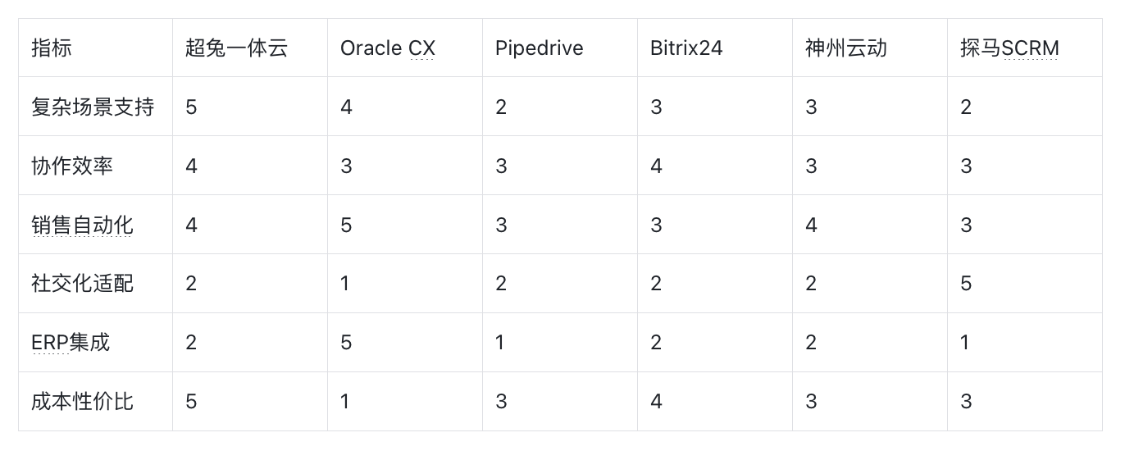 我们选取复杂场景支持、协作效率、销售自动化、社交化适配、ERP集成、成本性价比六大核心指标(1 - 5分,越高越好),绘制雷达图如下: