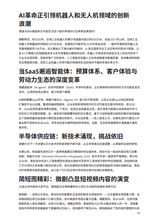2026年2月发布,德勤《2026科技、传媒和电信行业预测报告》长达121页,深度剖析了未来两年AI、媒体、通信等领域的发展趋势,并指出:AI虽在加速落地,但理想与现实之间的差距依然存在。