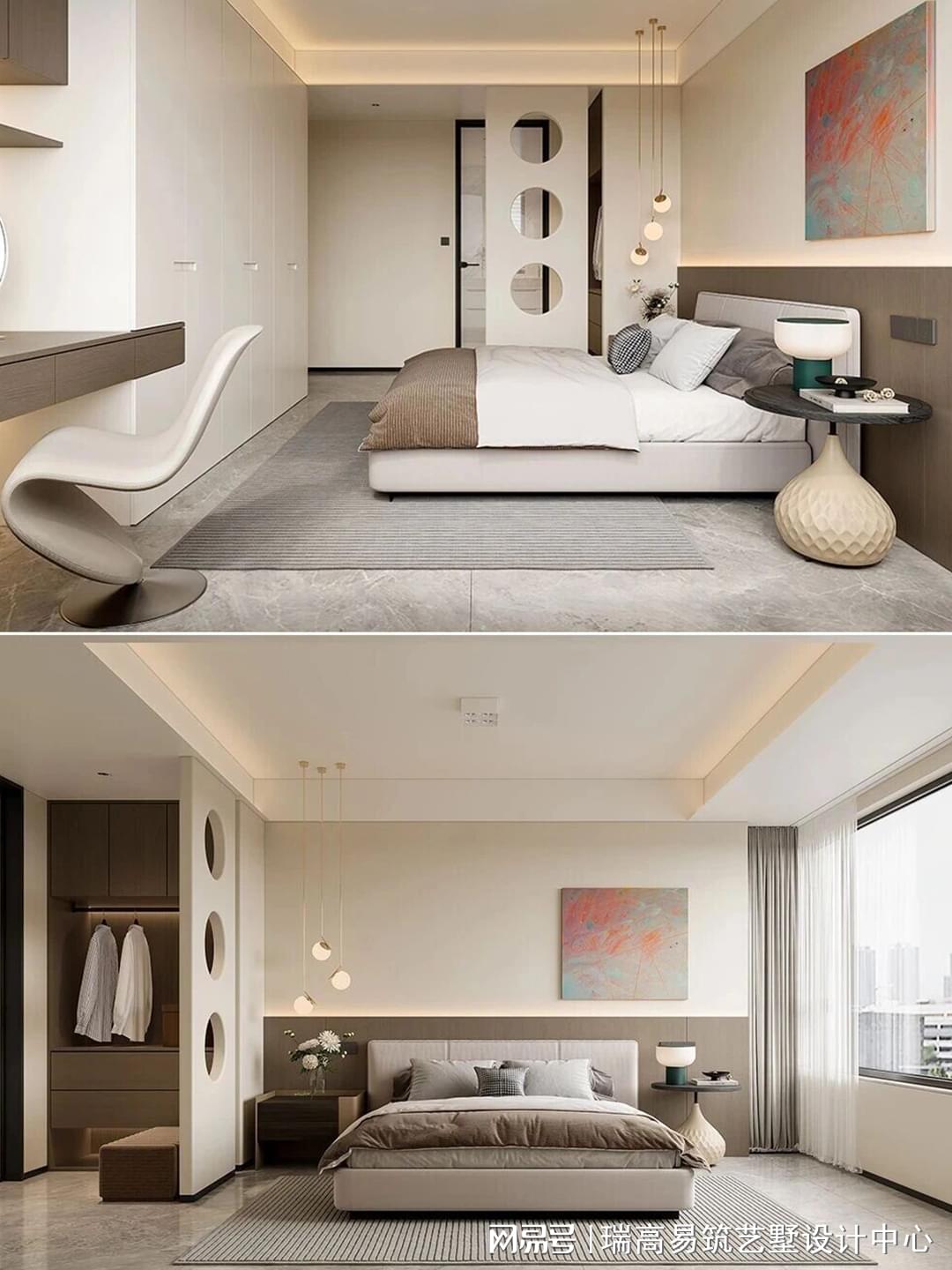 卧室设计说明:以 “静谧疗愈 + 功能复合” 为核心的现代简约卧室:延续整体空间的低饱和基调,营造既满足睡眠需求,又兼具储物功能的松弛型卧室。