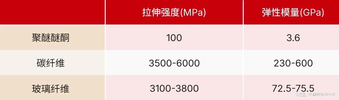 通常来说,PEEK的拉伸强度约100 MPa,弹性模量在3.6 GPa左右;而碳纤维(CF)的拉伸强度在 3500 MPa 到 6000 MPa 之间,弹性模量介于230 GPa到600 GPa之间;玻璃纤维(GF)拉伸强度通常在 3100 MPa 到 3800 MPa之间,弹性模量范围在72.5 GPa到75.5 GPa。